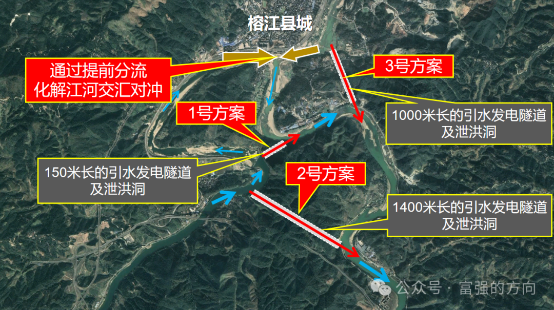 在都柳江大拐彎的黑臉巖西側山體最窄處,開挖一個長約150米的大洞徑隧道,也可以考慮直接將山體開挖,修建過水明槽,然後修建“過水低壩洞庫式水電站”。平常水位不過水,洪水來臨時才過水。