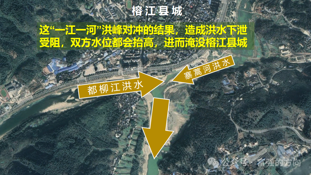 關鍵是,都柳江與寨蒿河在縣城南側的交匯處是“對沖流向”。這一江一河在交匯處都會形成洪水的下泄阻力,進一步抬高了水位。這就是萬年水患的根源所在。