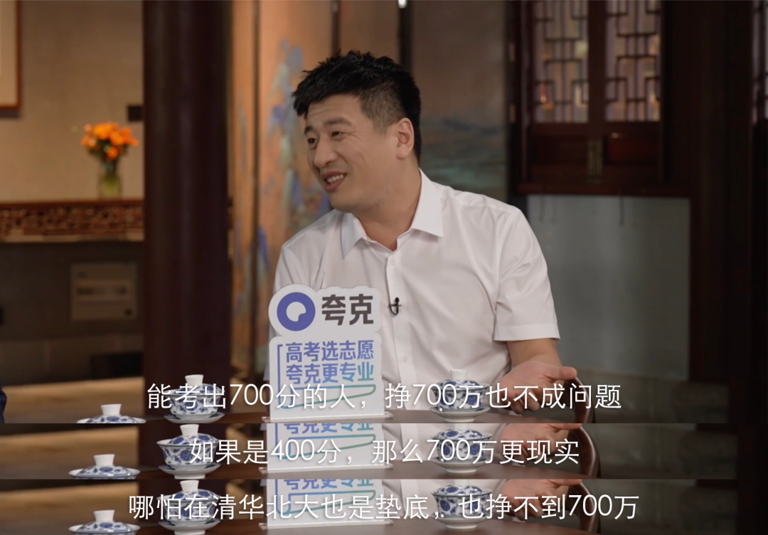 在這次對談中,他繼續站在現實的一端,把“高分未必高命”的殘酷真相擊破給屏幕前的家庭看,“能考出700分的人,掙700萬也不成問題。如果是400分,那麼700萬更現實,哪怕在清華北大也是墊底,也掙不到700萬。”