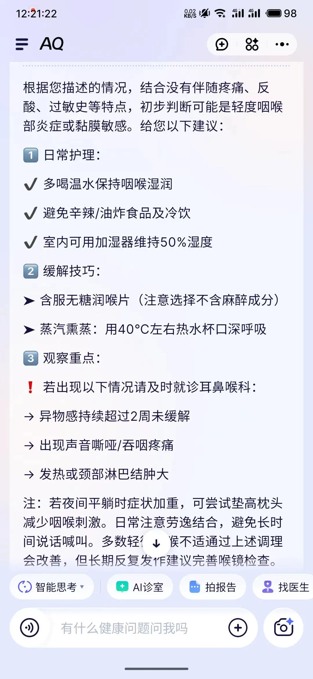 比如世超最近嗓子不舒服,老是卡痰,也沒去醫院看過,就讓它幫我看看。。別説,問得是真詳細,最後還從日常護理、緩解技巧、觀察重點三個部分給了我建議。