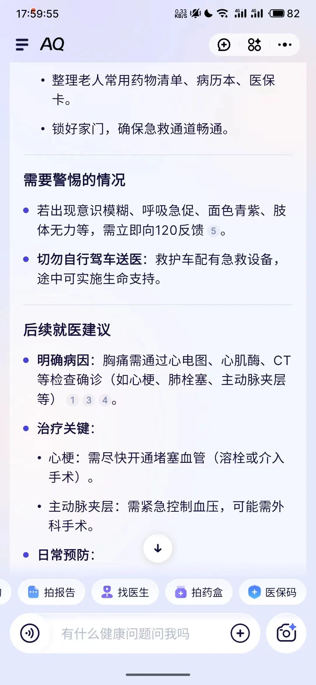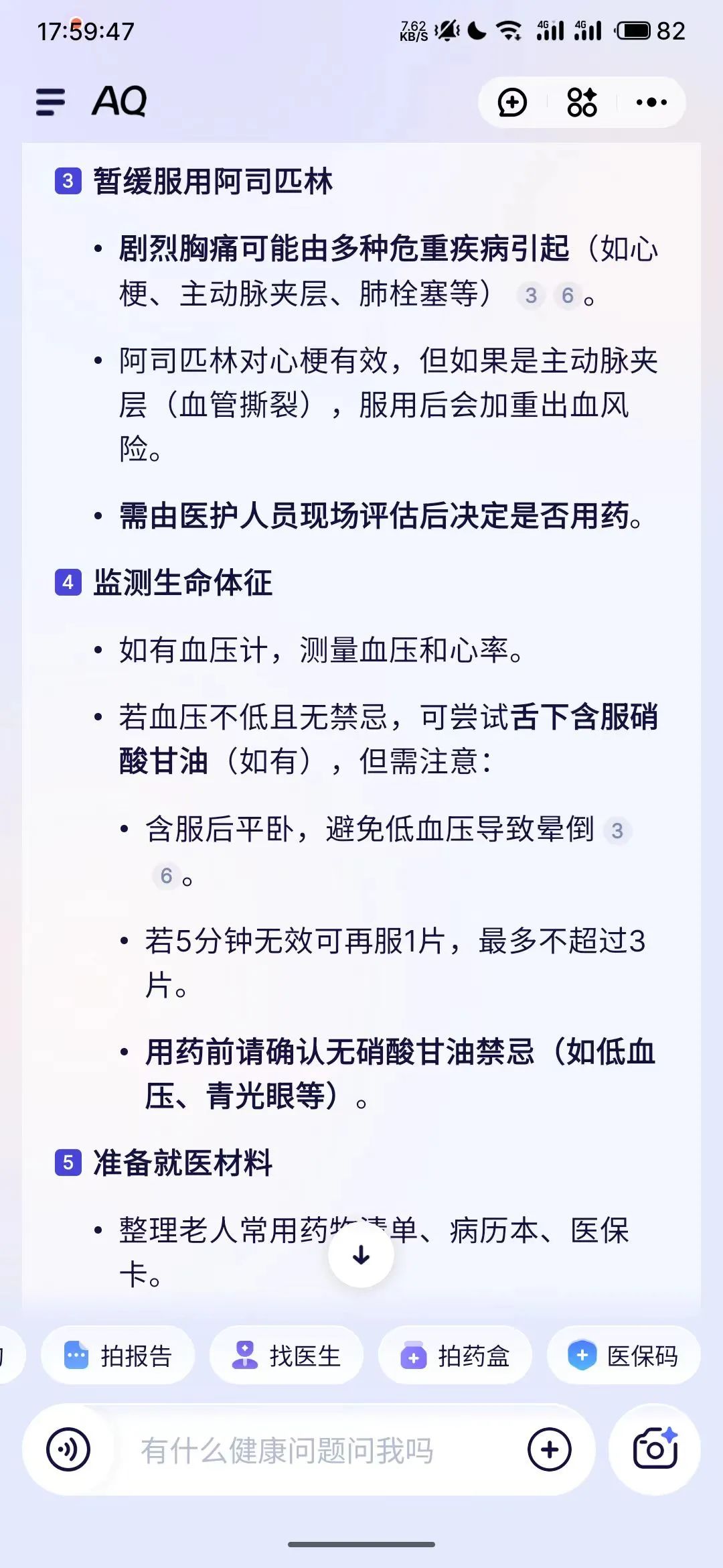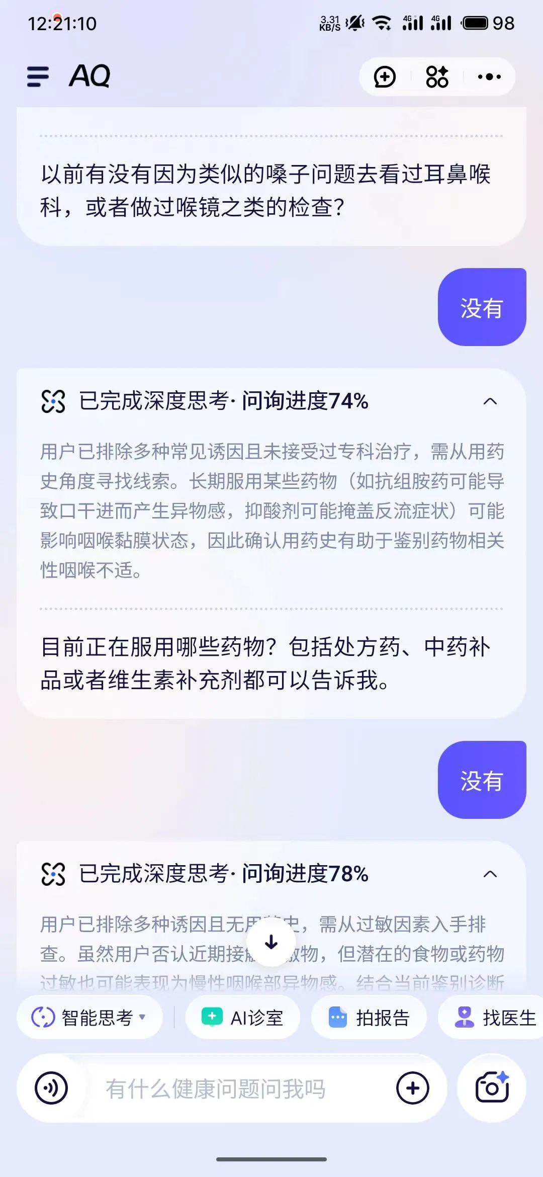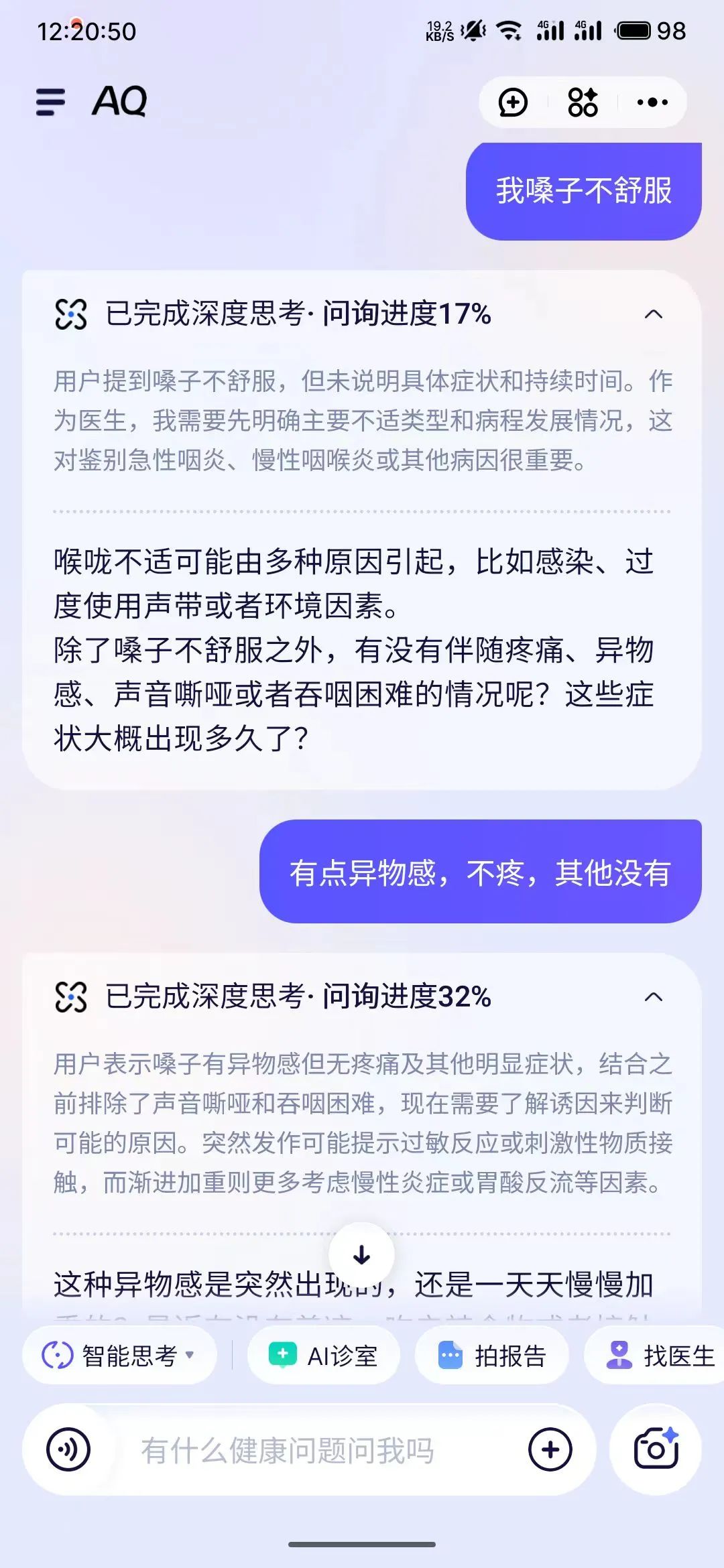 AQ另一個讓我驚喜的地方,是在“AI診室”模式下,它會像個真人醫生一樣追問你,因為大部分人面對AI,是不知道提問的。現在,你只需要回答問題,它就會用背後的知識庫分析你的病情,進而給你建議。