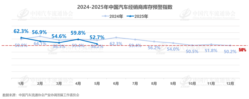 實際上,經銷商困境由來已久。據中國汽車流通協會發布的最新一期“中國汽車經銷商庫存預警指數調查”VIA顯示,2025年5月中國汽車經銷商庫存預警指數為52.7%,同比下降5.5個百分點,環比下降7.1個百分點。庫存預警指數位於榮枯線之上,汽車流通行業景氣度有所改善。