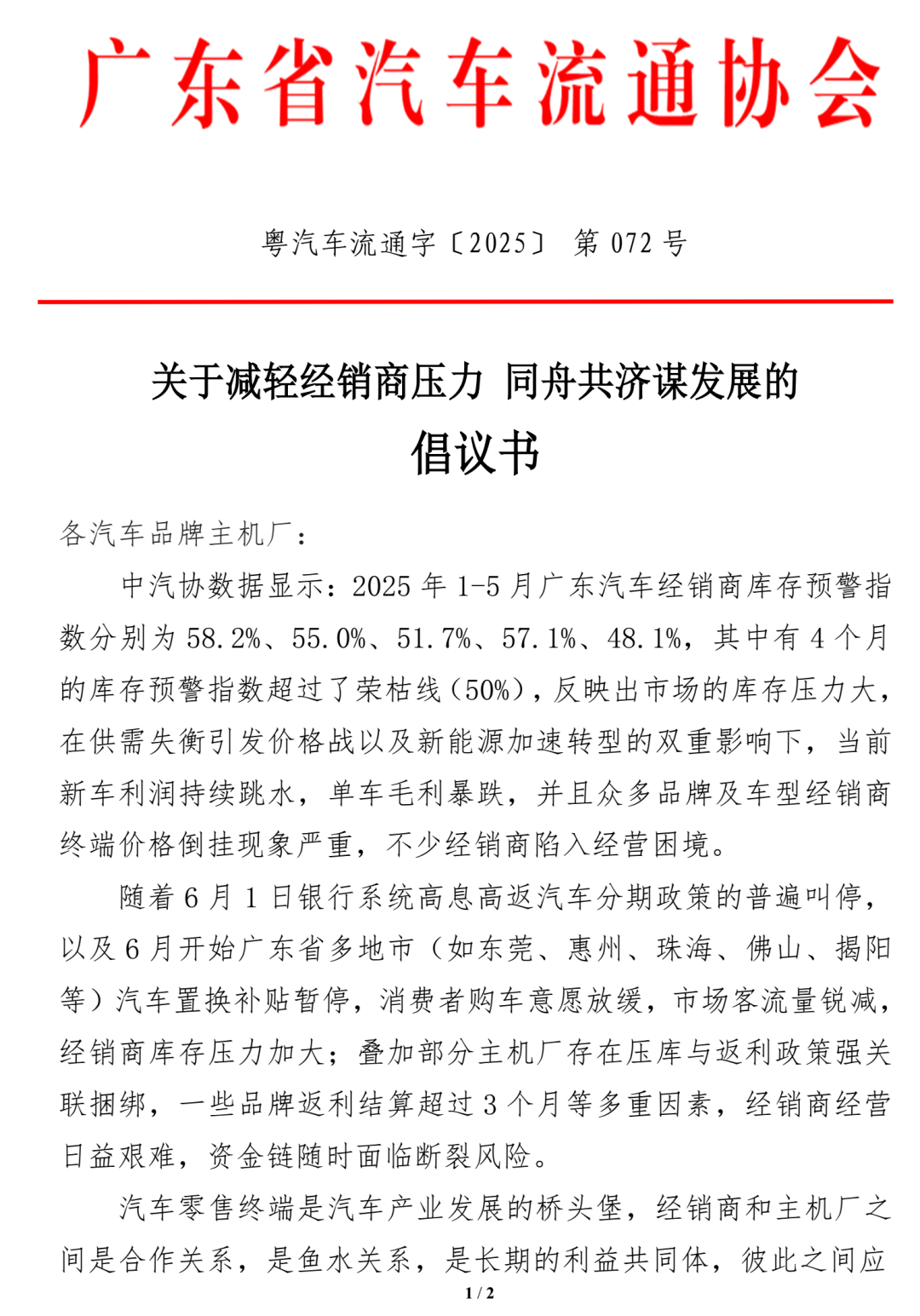 廣東省汽車流通協會也指出,隨着6月1日銀行系統高息高返汽車分期政策的普遍叫停以及6月開始廣東省多地市(如東莞、惠州、珠海、佛山、揭陽等)汽車置換補貼暫停,消費者購車意願放緩,市場客流量鋭減經銷商庫存壓力加大;疊加部分主機廠存在壓庫與返利政策強關聯捆綁,一些品牌返利結算超過3個月等多重因素,經銷商經營日益艱難,資金鍊隨時面臨斷裂風險。