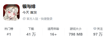 從這些維度來看,《銀與緋》展現出了一種和當下主流二遊截然不同的特質,也正因如此,早在正式公測前,遊戲就在 TapTap 上收穫了超 84 萬預約和90萬關注,位列預約榜第二。如今遊戲正式上線,這份熱度也成功兑現,轉化為了實打實的活躍用户和熱門榜第一。