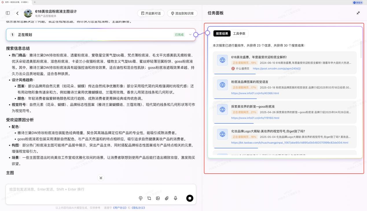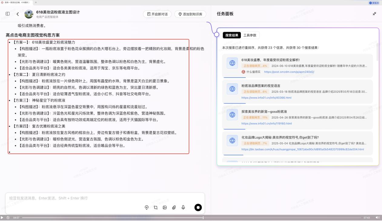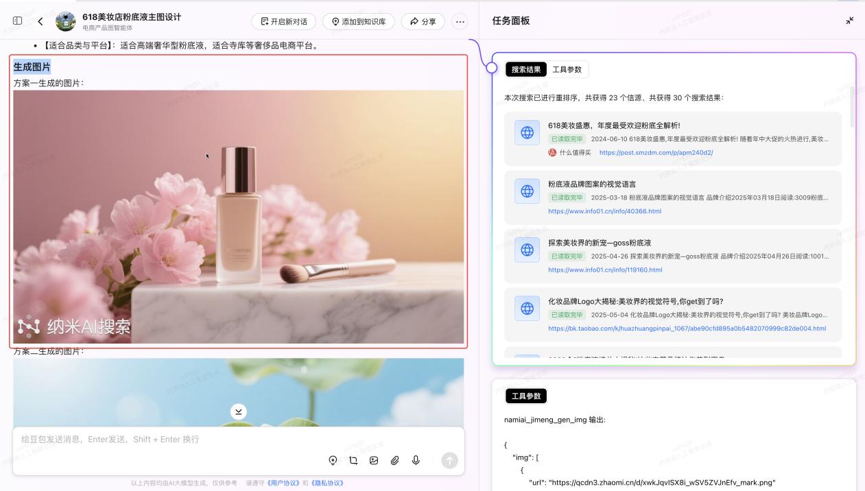 這種糾偏帶來的實際體驗提升,在實際場景中尤為顯著。譬如在618期間,美妝商家想要重新設計商品主圖,以此提振點擊率和銷量。在納米AI超級搜索裏,只需輸入這樣一句話,無需多餘提示詞,納米AI即可完成從搜索到結果呈現的一系列工作。