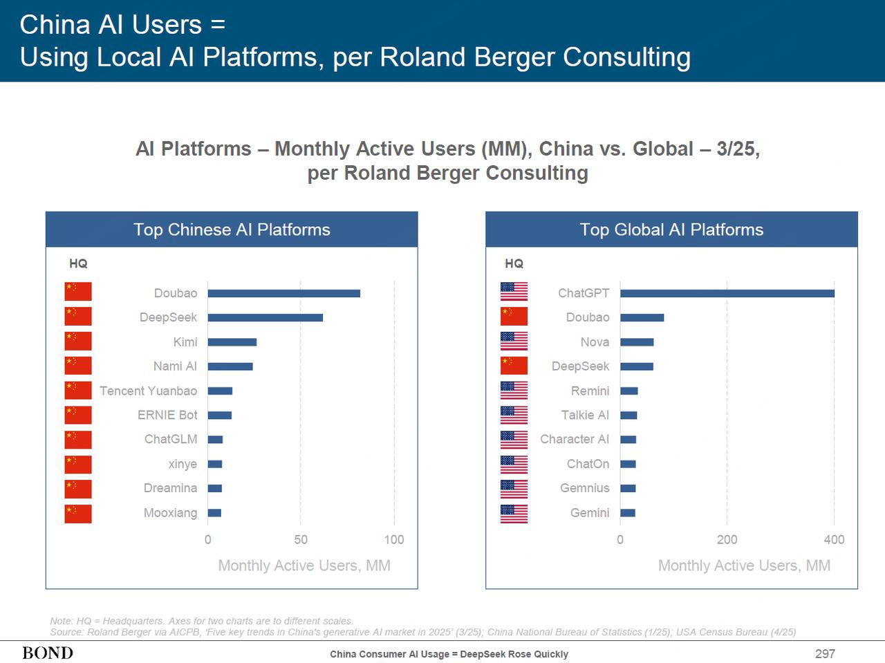 在月度用户活躍量這一核心指標中,中國有兩家公司進入全球市場前5。在中國市場,字節豆包、DeepSeek分列前二之外,Kimi、納米AI緊跟其後,騰訊元寶和百度文心一言則位於第五、第六的位置。