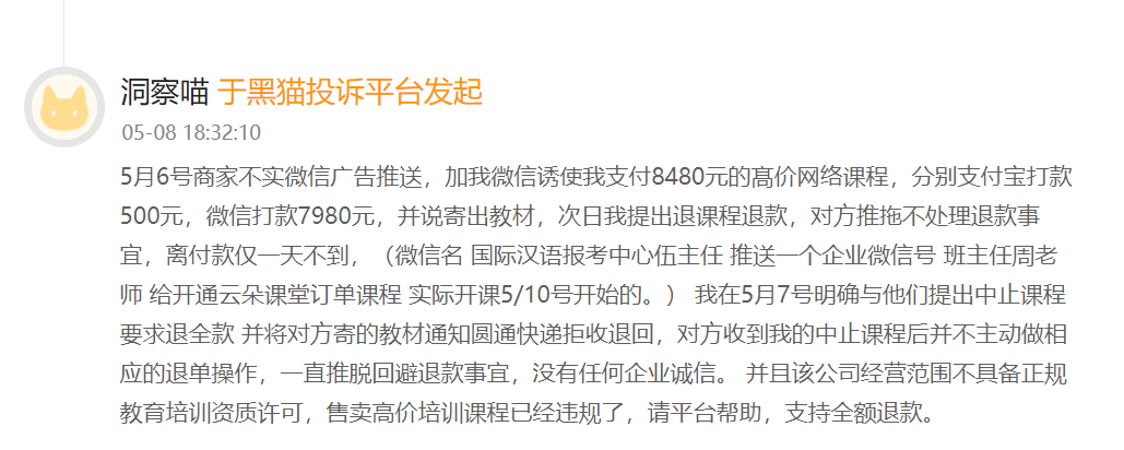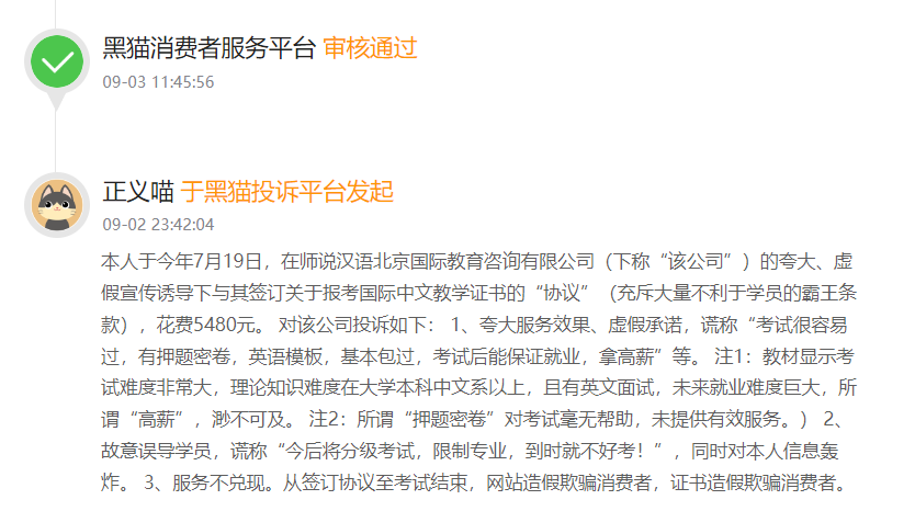 據瞭解,在黑貓投訴等平台上,大量針對師説漢語的投訴,集中指向了虛假宣傳問題。許多消費者反饋,在報名之前,師説漢語的銷售人員為了誘導他們繳費,作出了一系列不切實際的承諾。