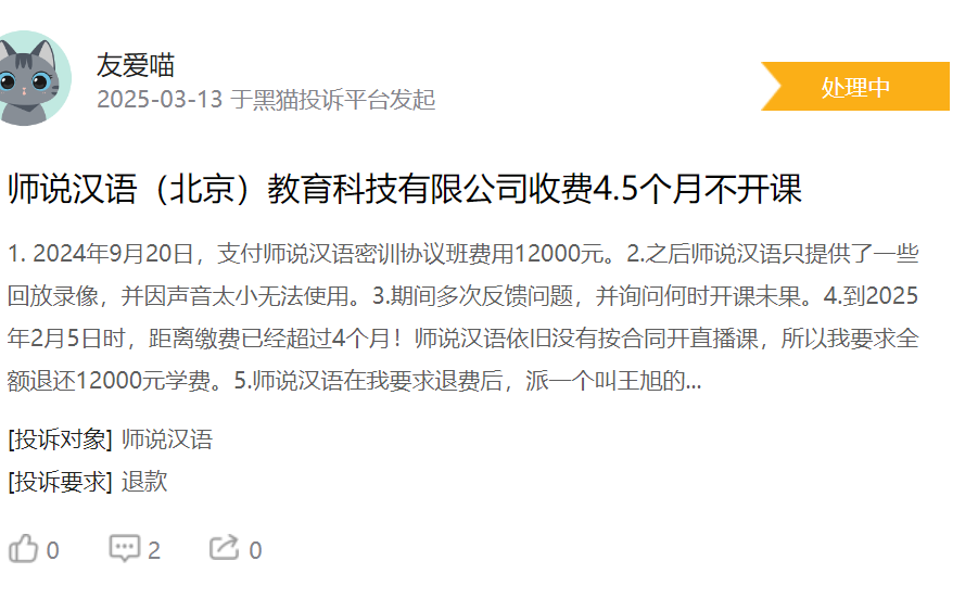 這種故意拖延退費的行為,嚴重損害了學員的合法權益,也進一步加劇了師説漢語的信任危機。消費者投訴不斷反映出師説漢語在經營過程中存在的諸多問題。