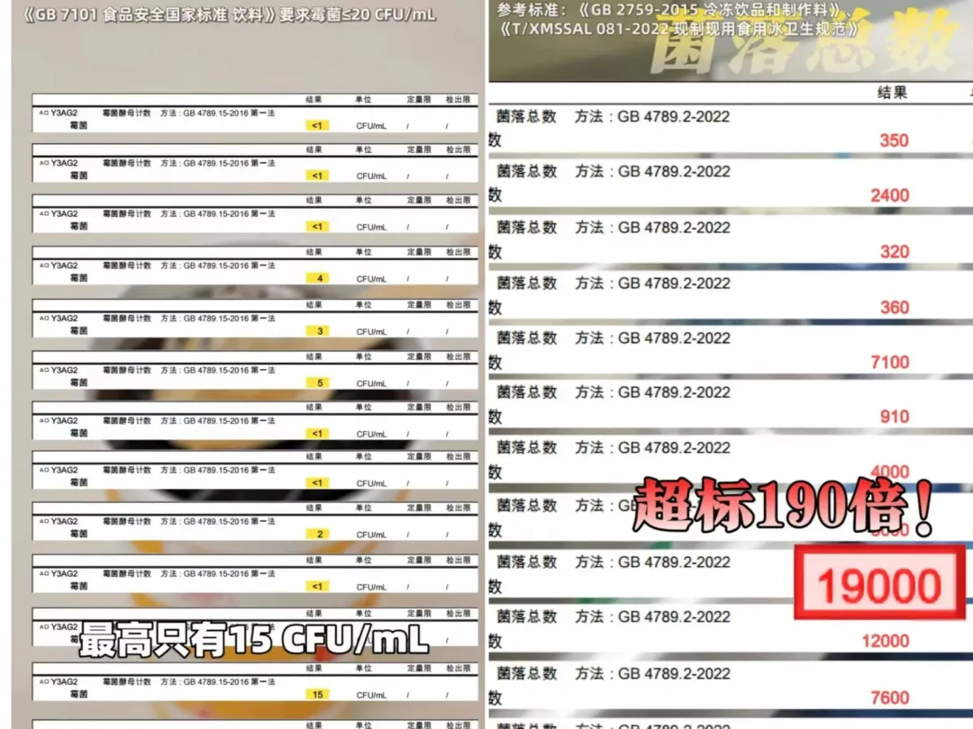 1、**致病菌全部未檢出:**所有樣本黴菌含量均低於飲料標準要求,且沙門氏菌、金黃色葡萄球菌等關鍵致病菌均未檢出;博主提到的“超標”是菌落總數和部分大腸菌羣。
