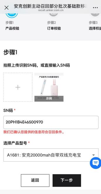 Zolo移動電源(20000mAh,30W,自帶雙線)。產品型號為A1681,是此次安克召回型號中的一個,電芯容量20000mAh。產品SN碼為:20PH1B4E46500970。記者在“Anker售後”公眾號上核驗上述SN碼,結果顯示:該充電寶符合召回條件。