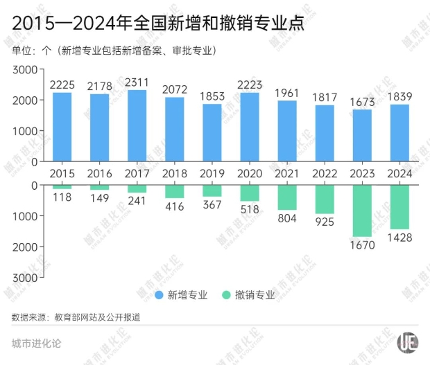 近兩年,全國高校專業調整力度持續加大。數據顯示,過去十年,我國共撤銷6636個高校本科專業點,其中僅2023年、2024年撤銷數量就達到3098個,佔過去十年撤銷數量的一半左右。