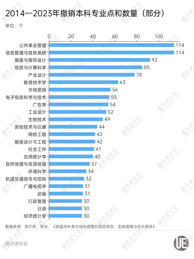 另據《我國本科專業結構調整的現實樣態、實踐邏輯與優化路徑》一文披露,2014—2023年,公共事業管理、信息管理與信息系統、服裝與服飾設計、信息與計算科學、產品設計、教育技術學、市場營銷、電子信息科學與技術、廣告學、工業設計等本科專業點撤銷最多,數量均在50個以上。