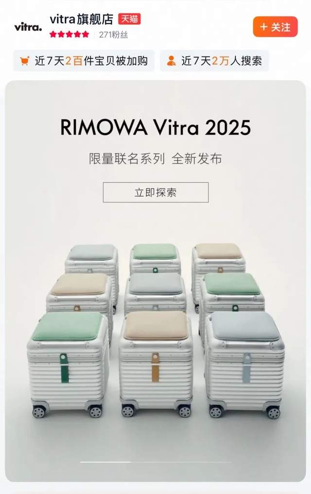 火遍半個世紀的“美人腰”潘通椅也來了天貓。6月15日,瑞士家居品牌Vitra正式入駐天貓奢品,發售RIMOWA Vitra 2025限量聯名系列。天貓旗艦店是Vitra品牌這一系列的獨家線上發售平台。