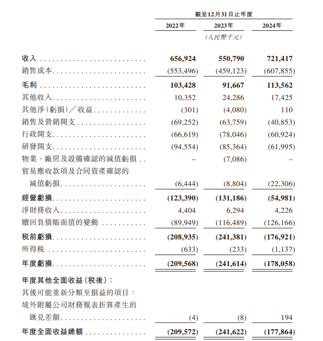 招股書顯示,2022-2024年,凱樂士營收分別為6.57億元、5.51億元和7.21億元,2024年較2022年增長9.7%,但同期淨虧損累計達6.3億元,在調整後淨虧損收窄至5050萬元。儘管虧損逐步收窄,但毛利率始終低於行業平均水平,2022-2024年分別為15.7%、16.6%和15.8%,遠低於同行業頭部企業20%-30%的毛利率水平。