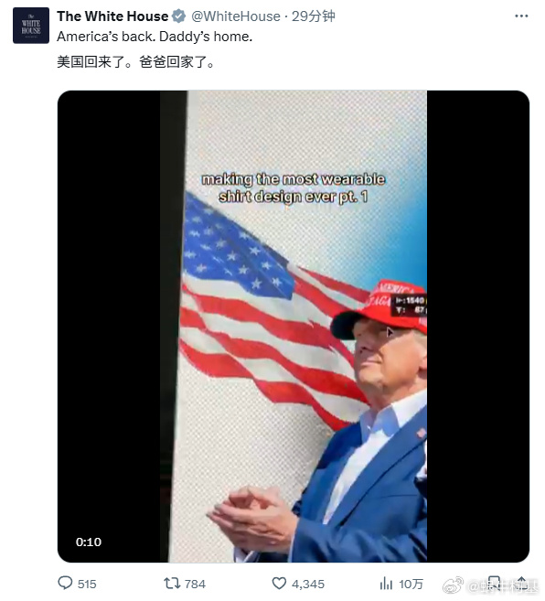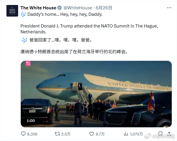 由於呂特叫特朗普爸爸,白宮特意發佈了特朗普參加北約峯會的剪輯視頻,標題:“爸爸回家”,配樂為:“Hey, Daddy”