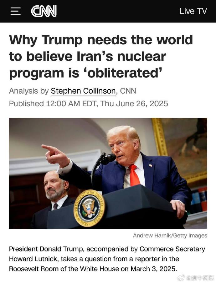 特朗普無數次地重複他的言論,因為他需要讓全世界相信伊朗的核設施已被摧毀,即使他的言論是假的。
