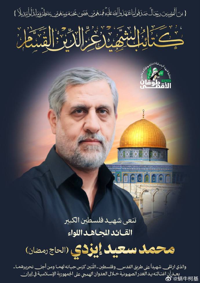 哈馬斯哀悼伊朗革命衞隊聖城軍巴勒斯坦軍團指揮官,穆罕默德·賽義德·伊扎迪准將的殉難。