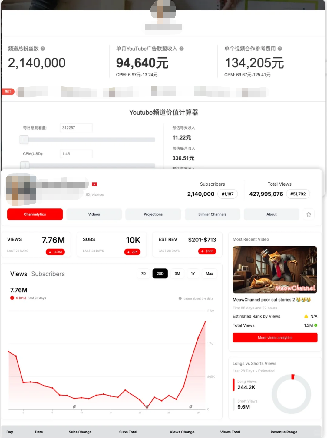 一位AI貓貓短劇賬號僅上傳了96個視頻,就在YouTube上擁有了近215萬訂閲,日均播放量30萬,光廣告分成每個月就有近10萬元。