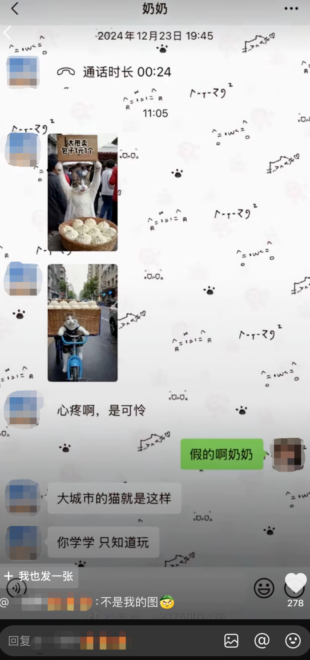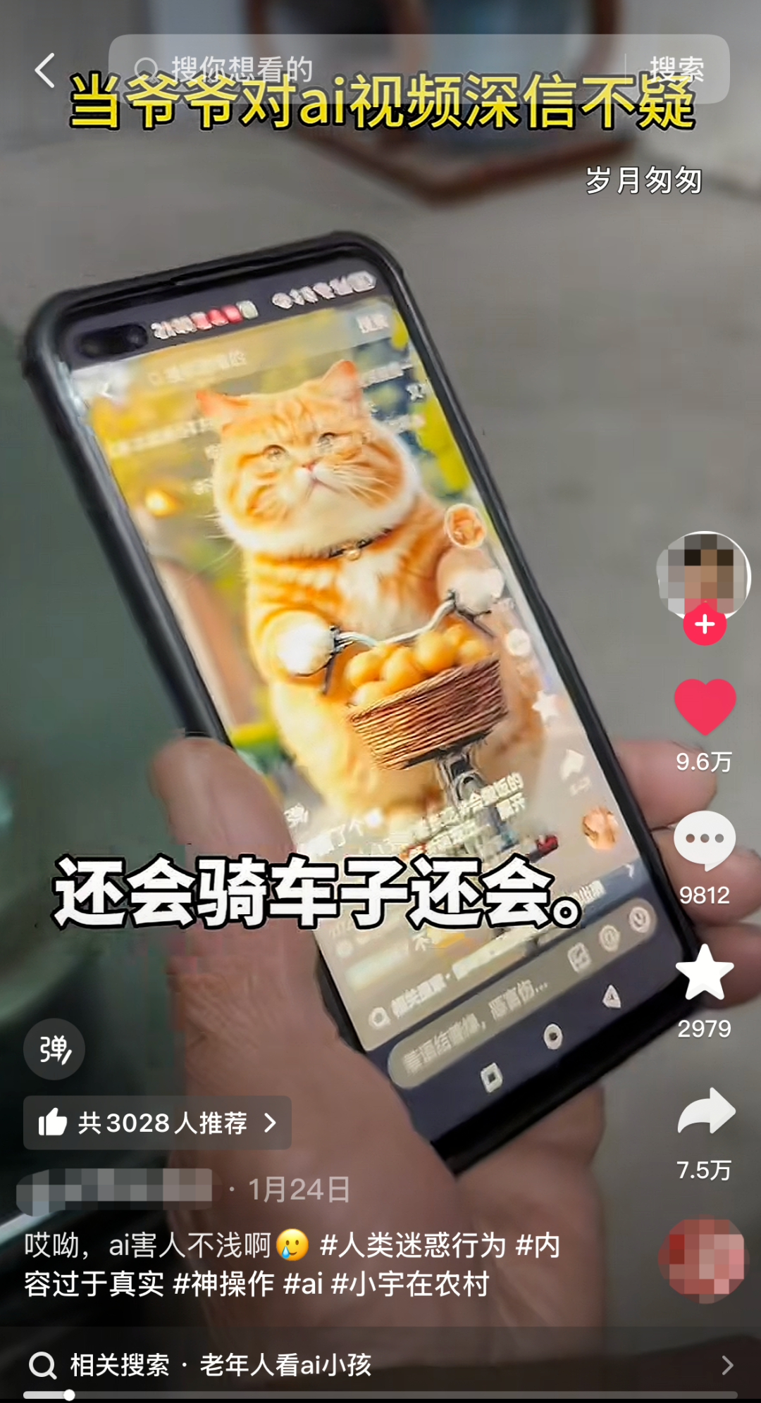 農村的狗子成了AI貓貓視頻的第一批受害者,老人家看完能歌善舞會做飯的貓咪之後,料定現在的貓狗已經進化成了擁有技能的樣子,“你看這小貓多能耐,還會騎車”“咱家小狗打狠了也能訓練成這樣”。