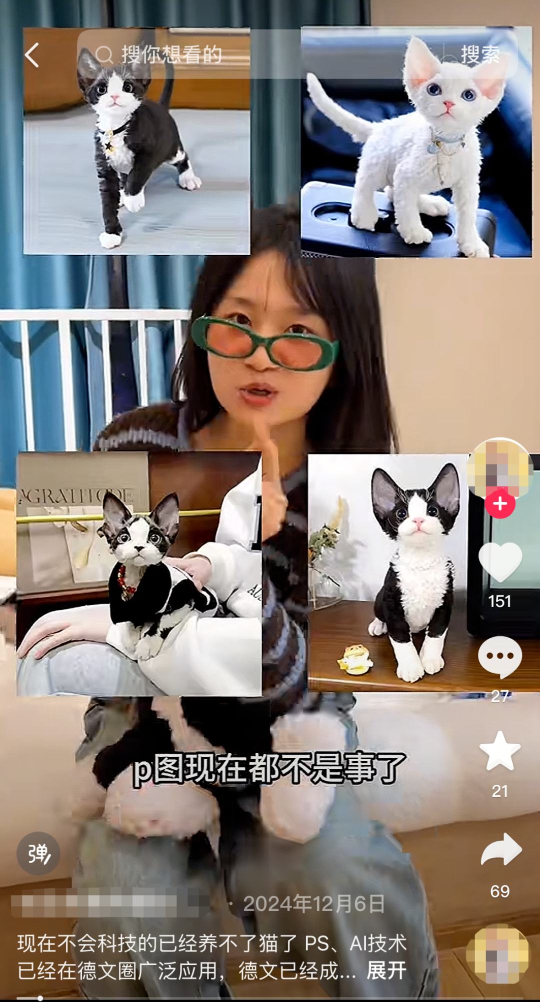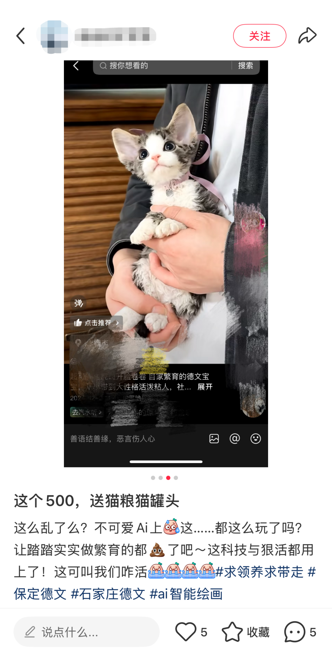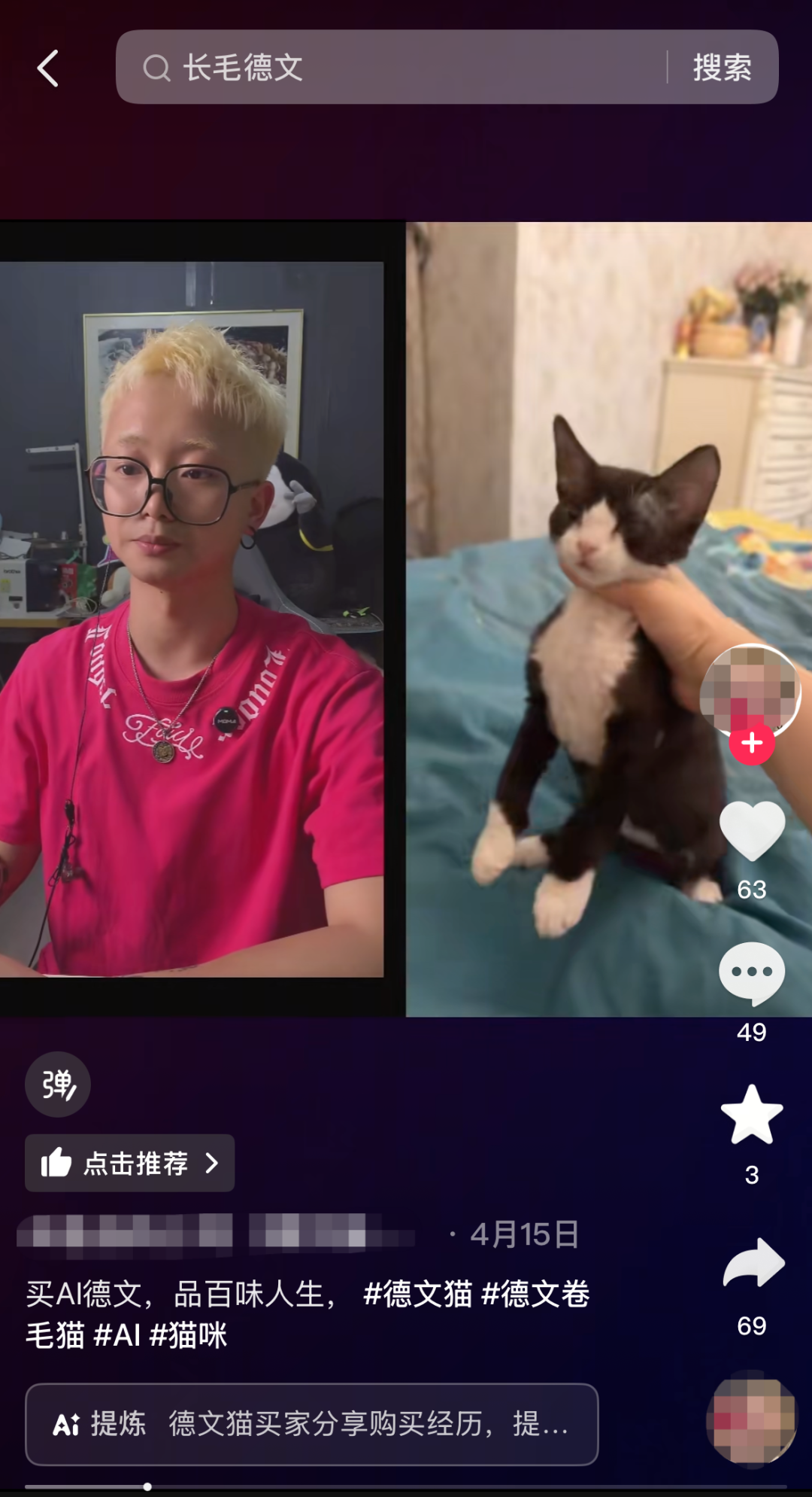 AI德文氾濫,已經積壓了真實德文的銷售空間,德文貓舍老闆不得不化身科普博主,為了賣貓在線科普:真正的德文鬍子沒那麼長,眼睛沒那麼黑,長相更是沒那麼甜。