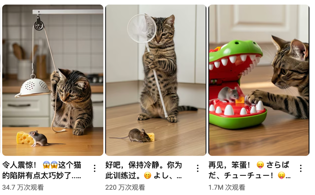 每個視頻十幾秒,每條內容都差不多:一隻AI虎斑貓用各種方法抓AI老鼠。