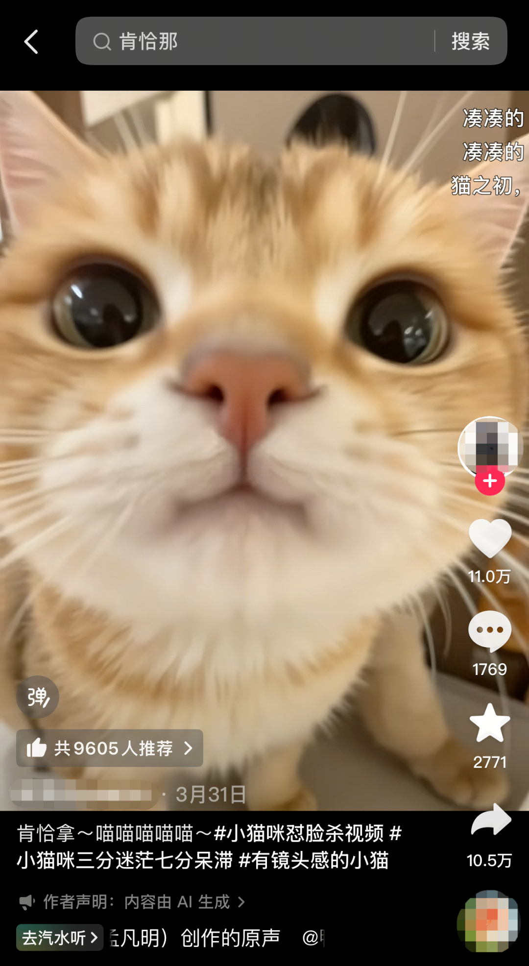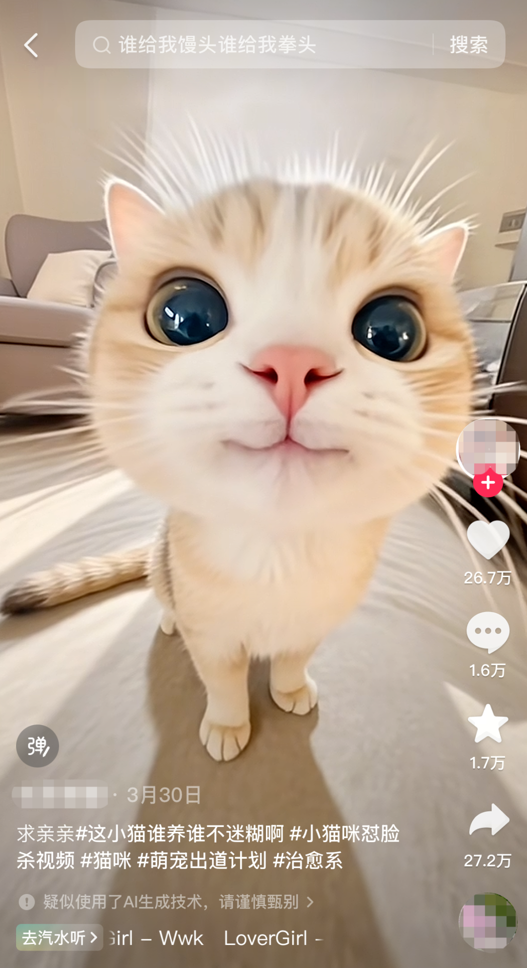 AI生成的貓咪懟臉拍視頻,也比真正的小貓更讓人着迷,在抖音上輕輕鬆鬆就能拿下十幾二十萬點贊。
