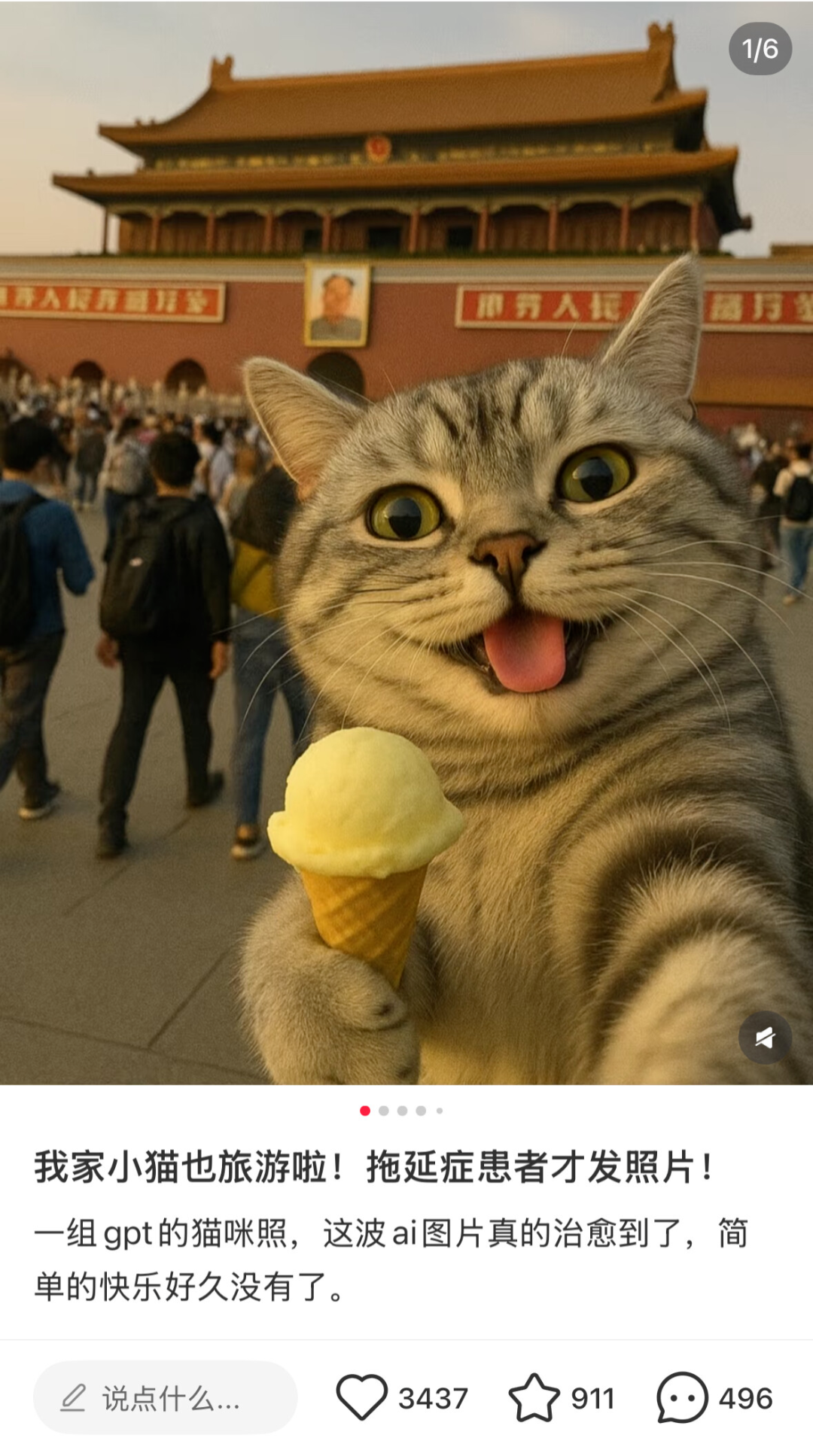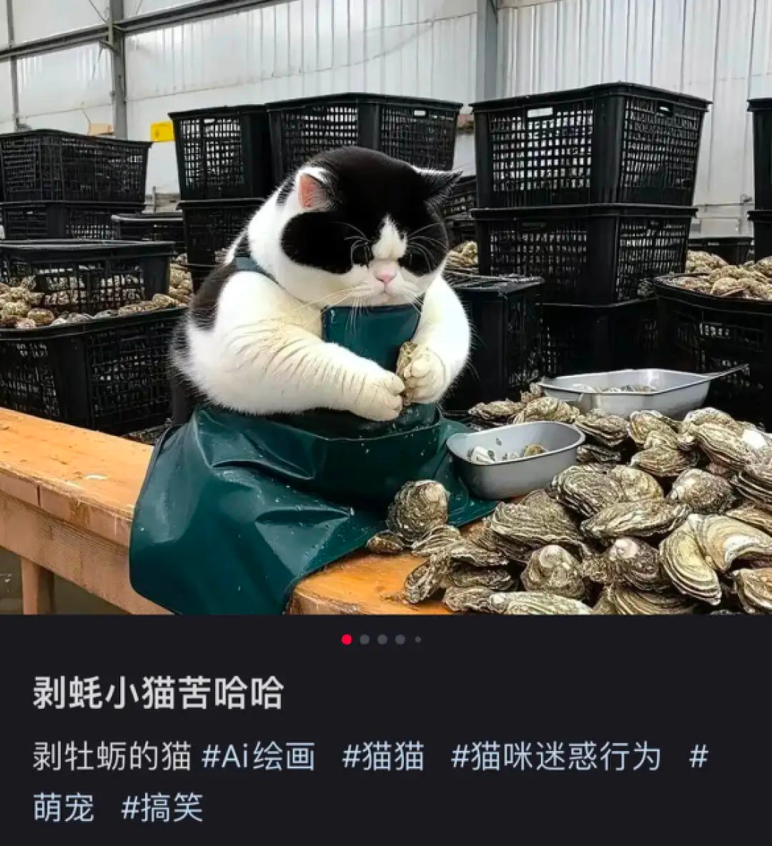 在文生圖成熟之後,人們開始使用AI生成各種各樣的貓咪,正在做飯的貓,會開生蠔的貓,當然也出現了專門生成AI貓咪照片的博主。