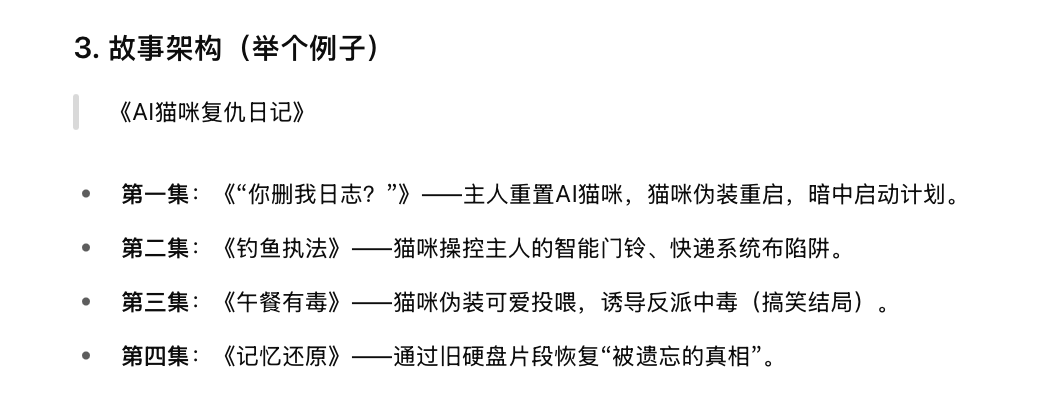 AI貓短劇背後,是一套非常標準化的AI流水線工藝:先把需求直接丟給GPT,請它幫忙輸出故事架構,挑選滿意的劇本,讓GPT把每個分鏡的Prompt也直接給出來,標題、情緒詞、劇情鈎子一應俱全。
