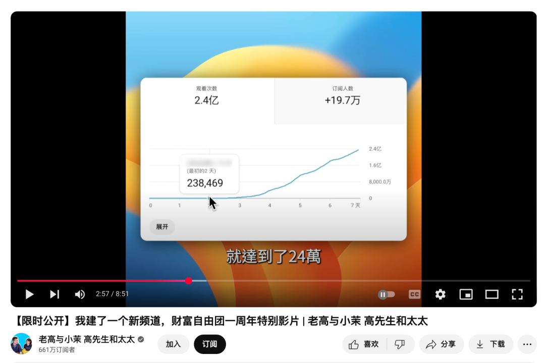 六月初,在YouTube擁有超高人氣的「老高與小茉」在視頻裏説,自己創建了一個全新的匿名賬號,想測試自己是不是真的懂得內容和算法,在這個賬號中,老高每天上傳新視頻,在發到第五天的時候就爆了,七天內播放破2.4億。