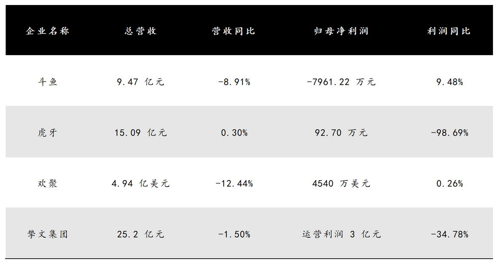 用户持續流失,讓昔日的直播霸主陷入增長承壓盈利乏力的困境中。2024年映宇宙全年營收僅同比增長0.1%至68.51億元,調整後淨利潤更是同比下降45%至2.34億元。2025年Q1,鬥魚、歡聚、摯文營收均出現不同程度下滑,虎牙營收增速更是僅有0.3%。