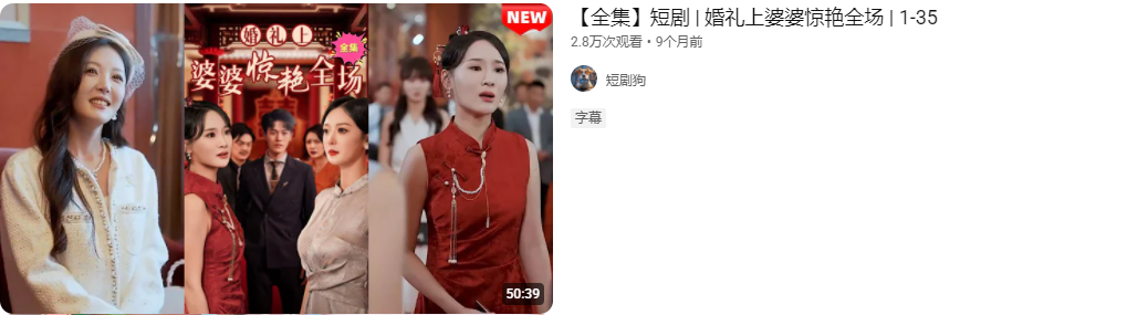 三是大量短劇的盜版、二創,給國內短劇在海外收入帶來嚴峻挑戰。在YouTube平台上,能搜索到大量國內熱門短劇合集。比如,映宇宙2024年十大累計熱力值TOP10的《雪落下的聲音》《婚禮上婆婆驚豔全場》等,但這兩部短劇合集在YouTube播放量分別僅有3950次和2.8萬次。