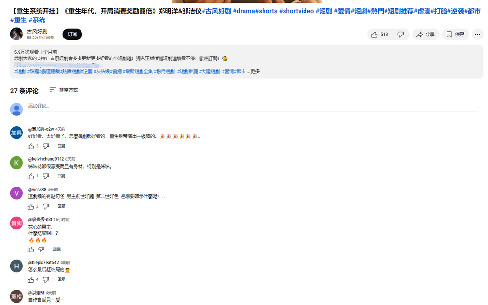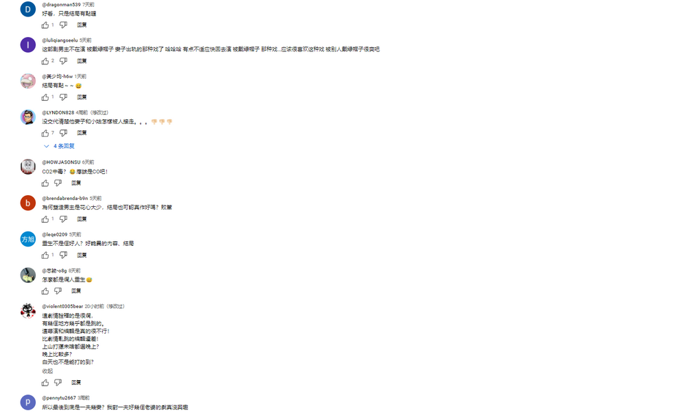 比如,在YouTube《重生年代,開局消費獎翻倍》的評論區中,雖有觀眾提到被劇中婆媳情感線打動,但結局爛尾、劇情交代不合理、不符合現實邏輯仍是槽點。這背後是觀眾覺得重生、婆媳題材“玩不出新花樣”,陷入套路化、同質化泥潭,導致觀看熱情下降。