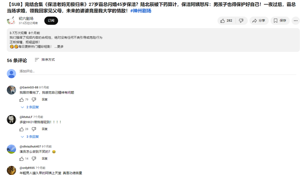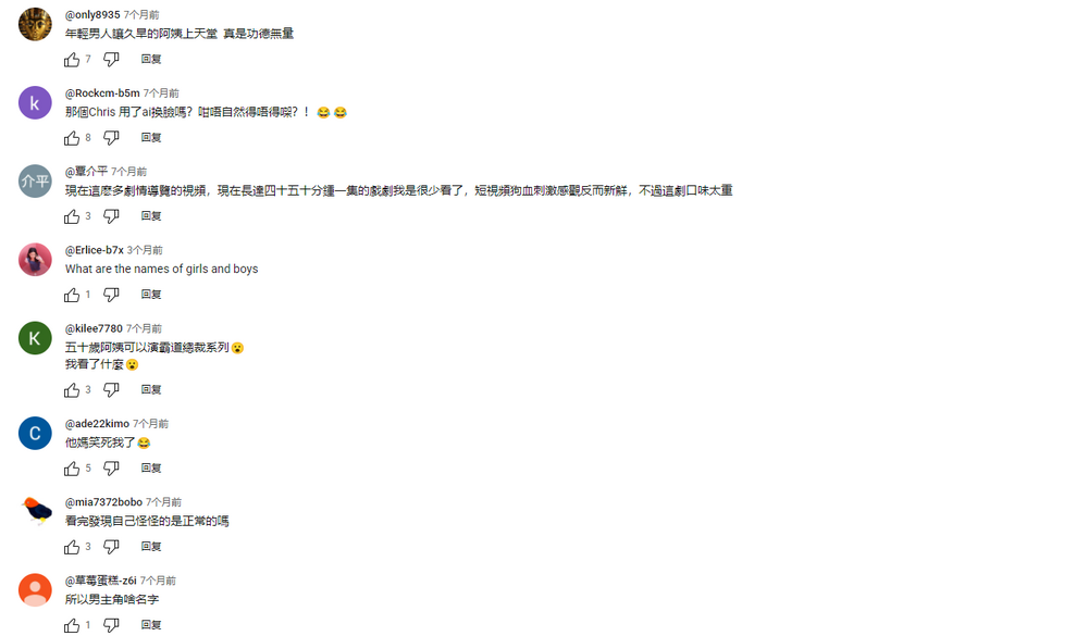 再比如,在YouTube《保潔老媽無極歸來》的評論區中,海外網友對霸總短劇的合理性明顯質疑。有網友稱,五十歲阿姨居然可以演霸佔系列?又有網友稱,女主選角不當和人物存在明顯差異。更有大量網友稱,自己到底是在看什麼東西。