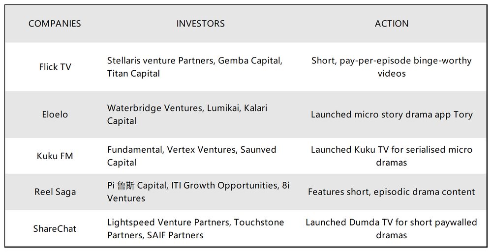 另據《The Economic Times》報道,印度除Flick TV、Eloelo、Kuku FM、Chai Shots、ReelSaga等初創公司外,亞馬遜、Share Chat和ZEE等大型數字平台紛紛進軍微劇市場,資本也在參投相關企業。比如,Reel Saga在今年5月拿下210萬美元融資,Flick TV在今年6月完成230萬美元的融資。
