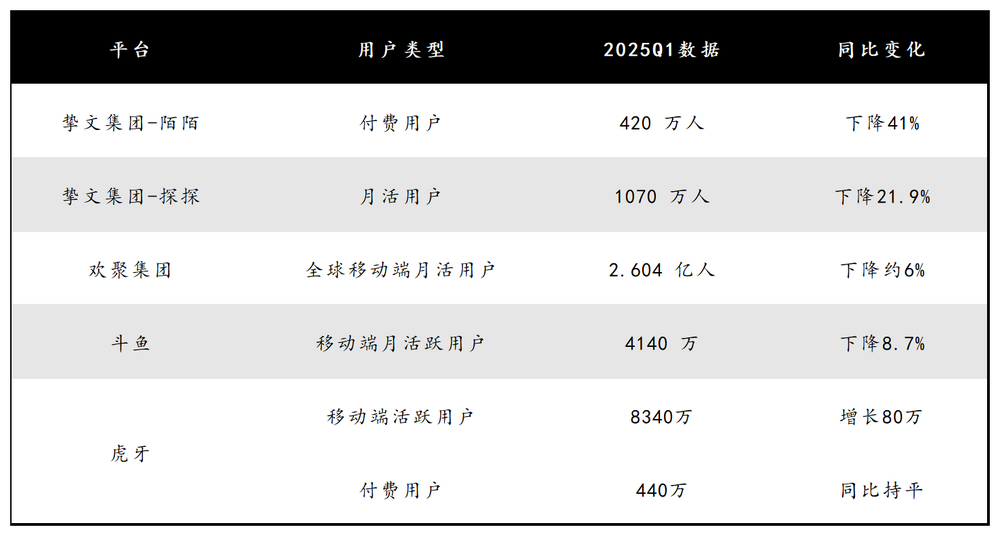 2024年映宇宙月活用户較去年同期下降8.6%至2083.6萬。2025年Q1,除虎牙用户相對穩定外,摯文、歡聚、鬥魚用户均出現不同程度下滑。
