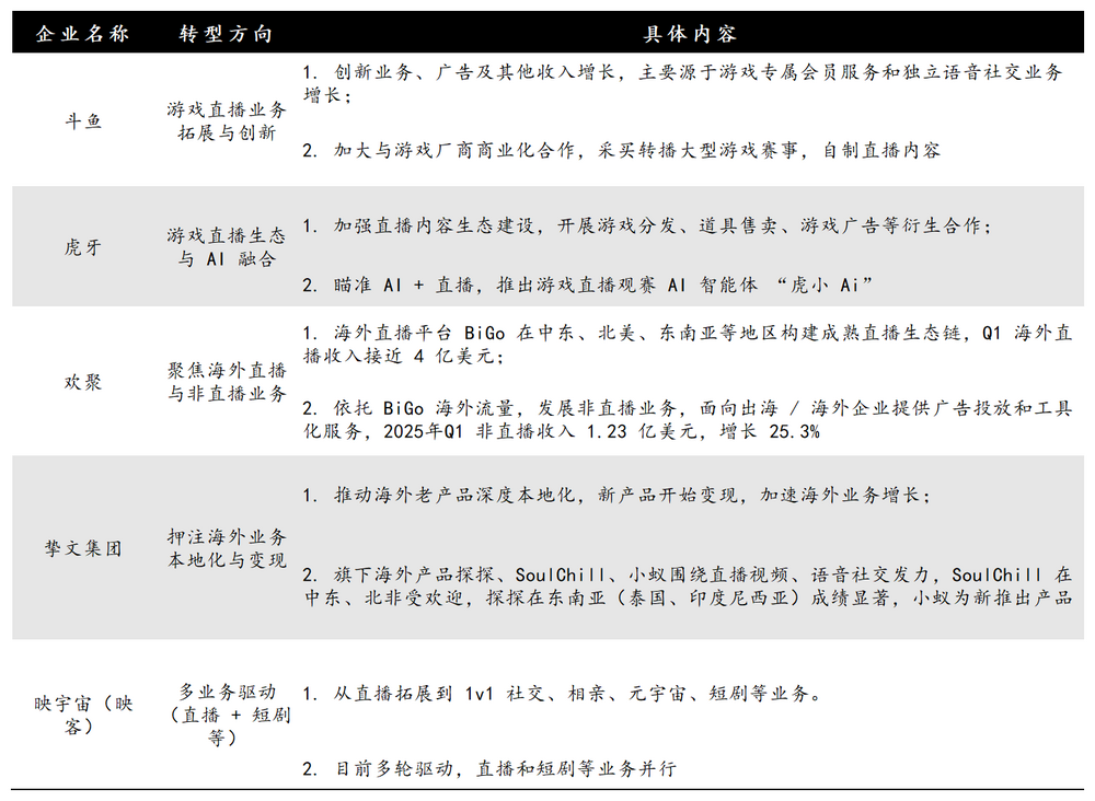 為加速轉型步伐,“AI+出海+殺入新業態”為當前傳統直播五巨頭轉型的方向。以映客為例,當前其轉型重心放到短劇上。截至2024年末,映宇宙集團已經推出超1000部微短劇,其中爆款短劇超80部。這些爆款短劇讓映宇宙娛樂內容服務營收從2023年的9.6億元增長至13.1億元,遠超映宇宙全年0.1%的增速。