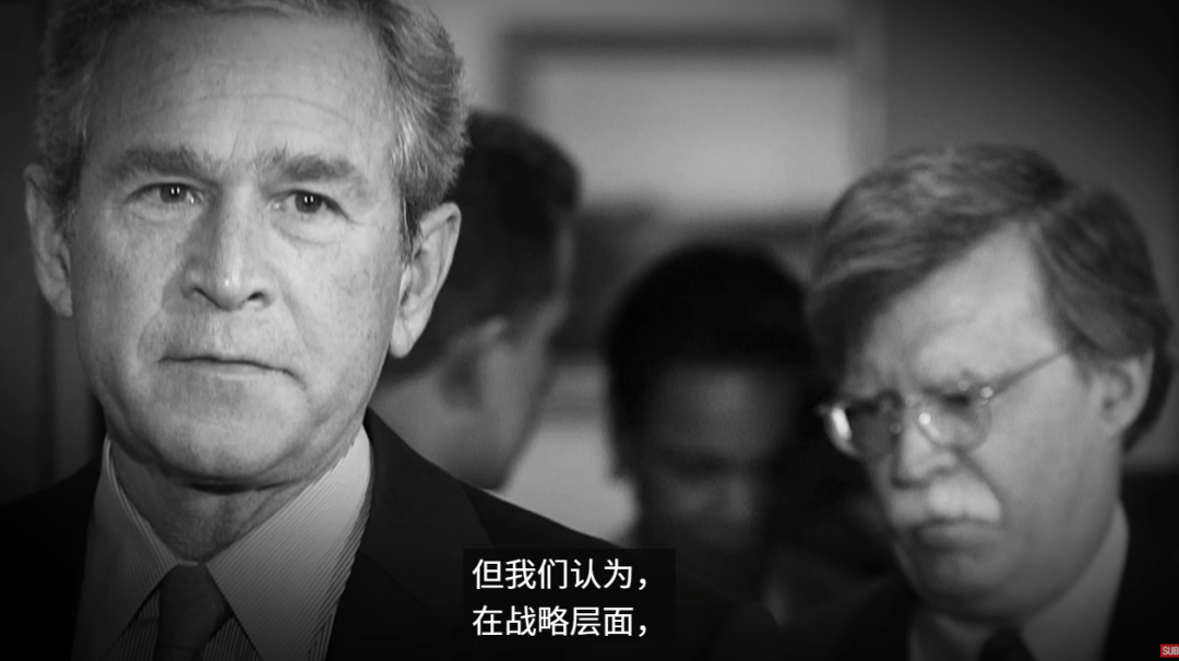“博爾頓”(右後)特朗普時期和特朗普鬧翻的國家安全顧問,2001年時在小布什手下擔任副國務卿,他為小布什勾畫了一份《新美國世紀》計劃