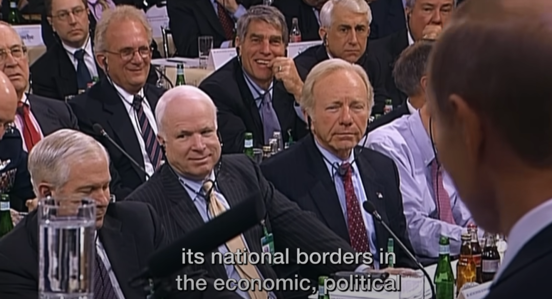當天美國參會的代表是共和黨著名議員麥凱恩等人,普京當着他們的面指責美國,而台下的美國人則一臉不屑