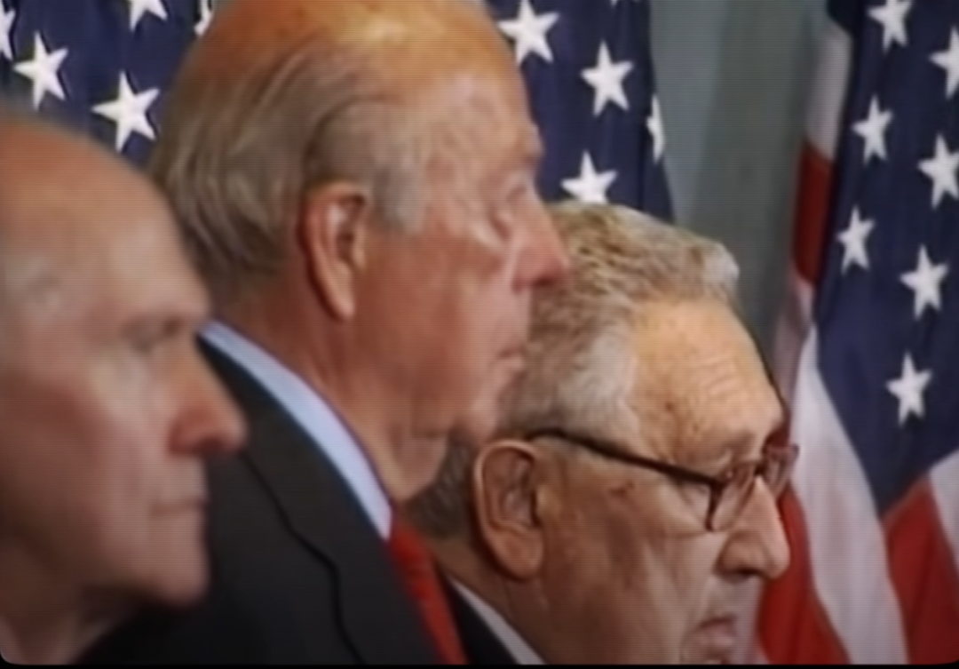 而小布什講話時,旁邊就站着三位“外交大師”,其中最著名的當屬“聯中制俄”的冷戰大師,基辛格