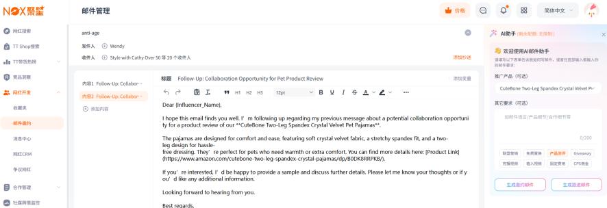 3. AI自動化邀約回覆:勾選紅人名單→系統自動匹配紅人郵箱→自動理解推廣brief→智能生成本地化語言郵件內容+推送→若紅人點擊/回覆→系統標記“已激活”並自動推薦個性化話術→若客户未響應→系統延遲24小時後再次發送不同內容並自動標記狀態。