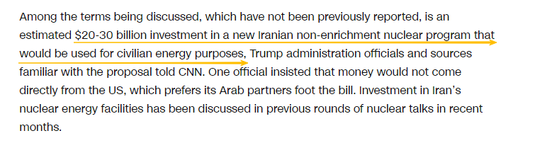特朗普政府官員和熟悉該方案的消息人士還向CNN透露了此前未曾報道過的細節——討論的條款之一是對伊朗用於民用能源的非濃縮鈾核項目投資約200億至300億美元。一位官員堅稱,資金不會直接來自美國,美國更希望阿拉伯夥伴買單,“美國願意主導與伊朗的談判。而且,建設核計劃需要有人出錢,但我們不會做出這樣的承諾。”