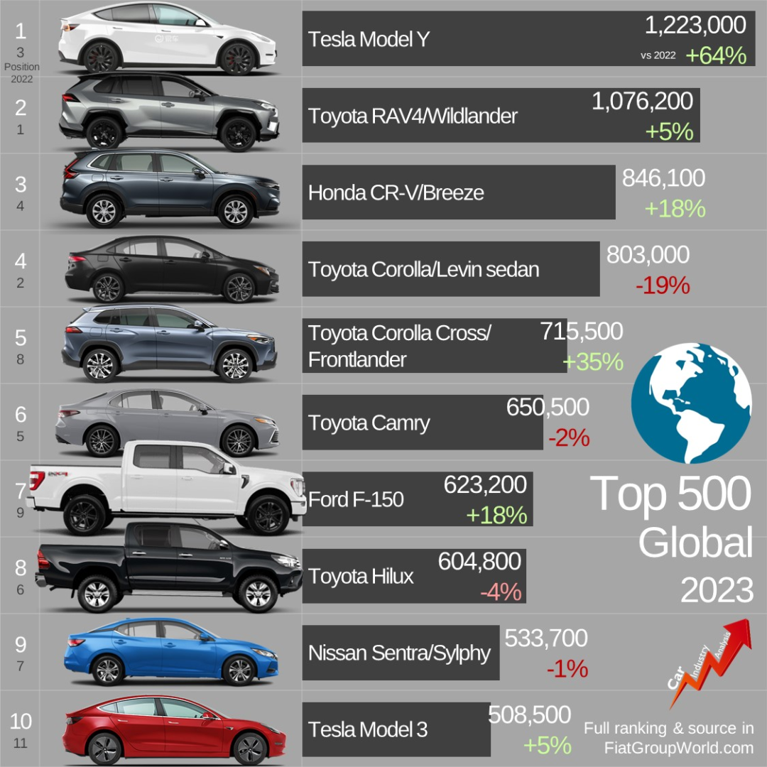四年後的 2023 年,特斯拉 Model Y 的銷量超過了老牌冠軍豐田,成為了全球賣得最好的單一車型,這是整個汽車史上從未過的。