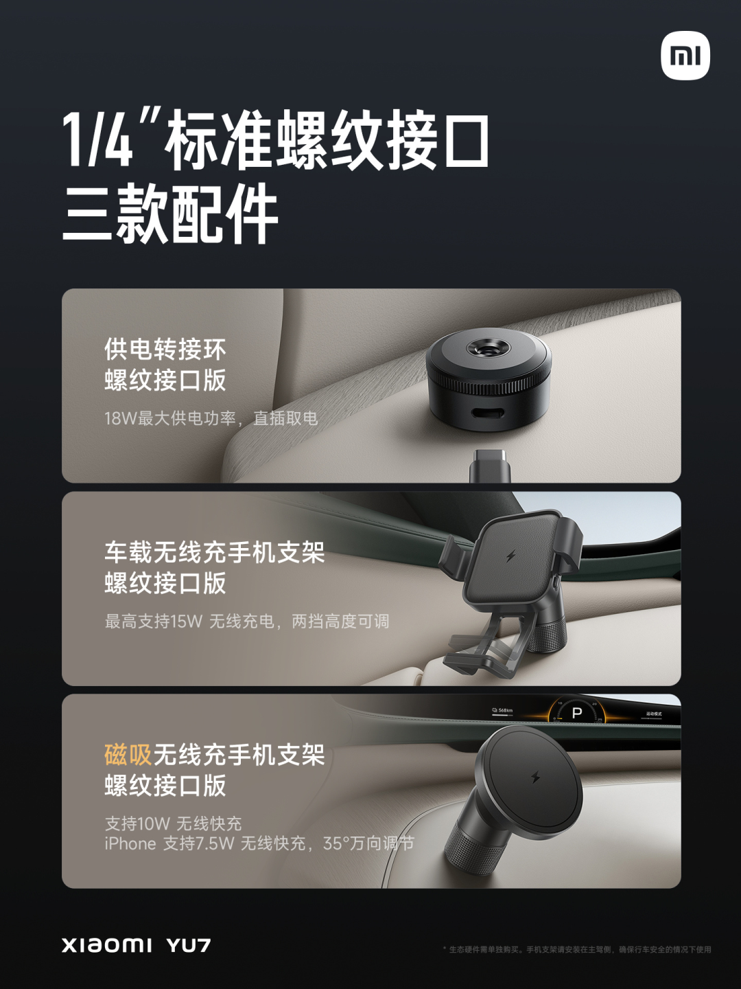 任何車裏能用到的配件,比如紙巾盒、眼鏡盒都,可以快速找到固定的錨點。甚至連 SU7 上就有的螺紋接口,這次也在 YU7 上變成了可以對外供電的版本,這樣你的手機就可以在一個順手的地方,始終保持充足的電量。
