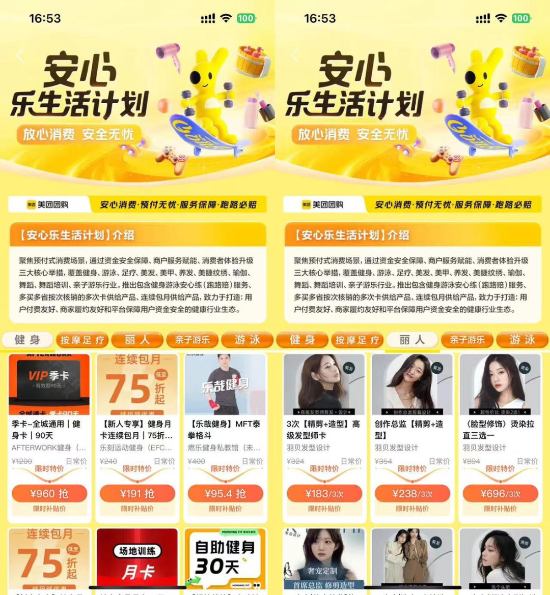倒不是什麼平台活動大促,這麼説吧,不管是健身游泳,還是做足療按摩、美容美髮,美團都在想法子給消費上保險。