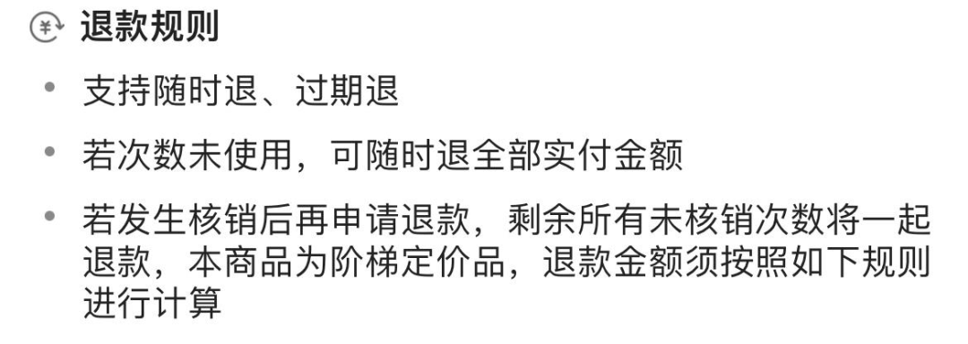 次卡的話就更加不需要擔心商家跑路了,消費完了再核銷,一手交錢一手交服務。即使買的是多次卡,沒用完的、過期了的,也全都能退,主打的就是一個安心消費。