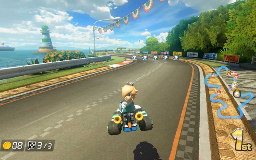 作為針對 WiiU 平台開發的馬車 8,馬車 8 終於有了看上去跟得上時代的畫面表現力,也帶來了反重力駕駛這一新特性。
