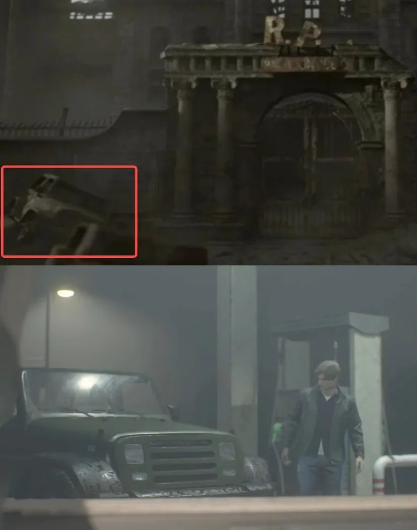 例如PV中浣熊市警局廢墟門口有一架汽車殘骸,外形和《生化危機2:重製版》里昂的車看上去很相似。