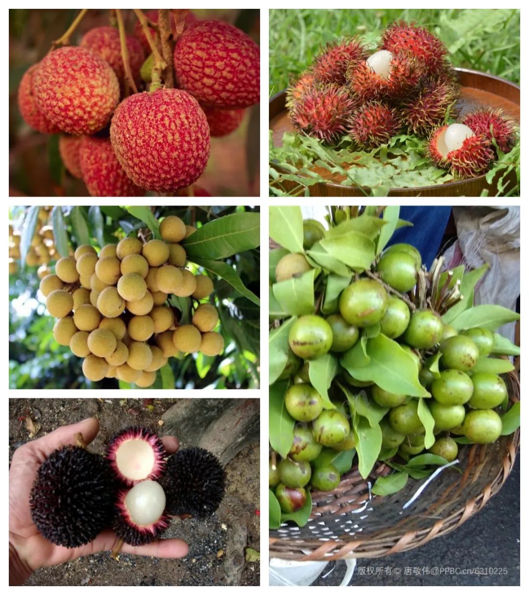除大家比較熟悉的荔枝和龍眼外,無患子科還有紅毛丹(右上),葡萄桑(左下),蜜莓(右下)等不算常見的水果,無患子科也是非常具有潛質水果開發的資源庫(蜜莓圖片來源:唐敬偉@PPBC,其餘圖片來源網絡)