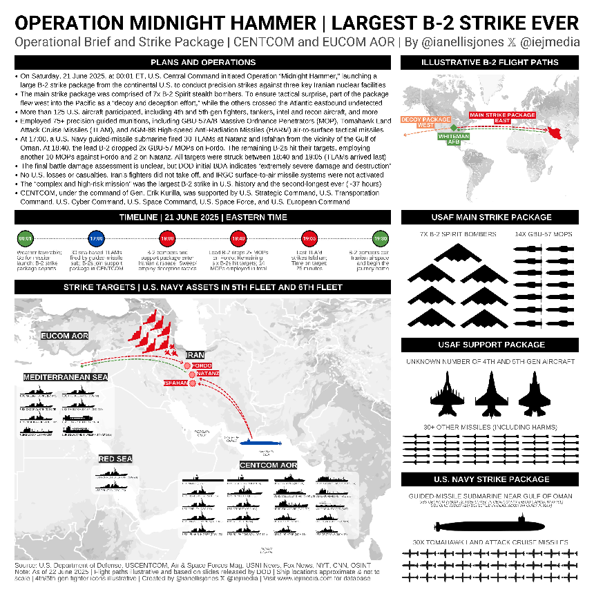 按照美防長赫格塞斯與美軍參聯會主席丹·凱恩説法,在對伊朗福爾多、納坦茲、伊斯法罕3處核設施打擊行動中。美空軍出動了超過125架的軍機,型號涵蓋B-2A、KC-135、F-22A、F-35乃至F/A-18E/E。使用包括GBU-57、“哈姆”反輻射導彈及“戰斧”對陸打擊巡航導彈在內的精確制導彈藥在75枚以上,另外美國海軍也派出了“喬治亞”號俄亥俄級巡航導彈核潛艇參與此次任務,着實是下了血本。