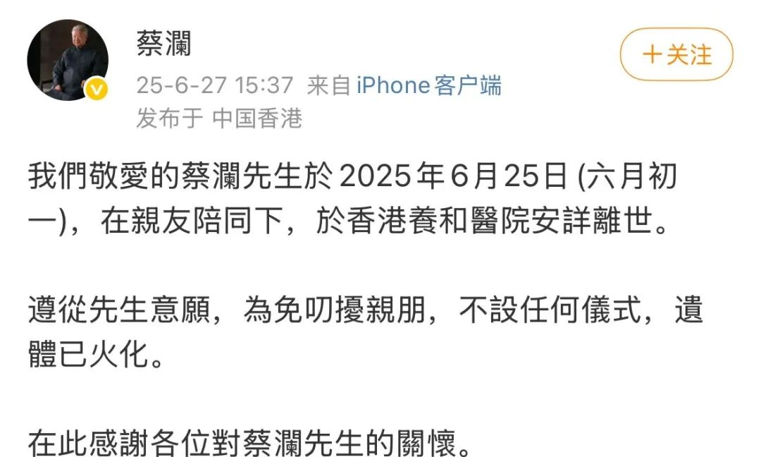 “我們敬愛的蔡瀾先生於2025年6月25日(六月初一),在親友陪同下,於香港養和醫院安詳離世。”